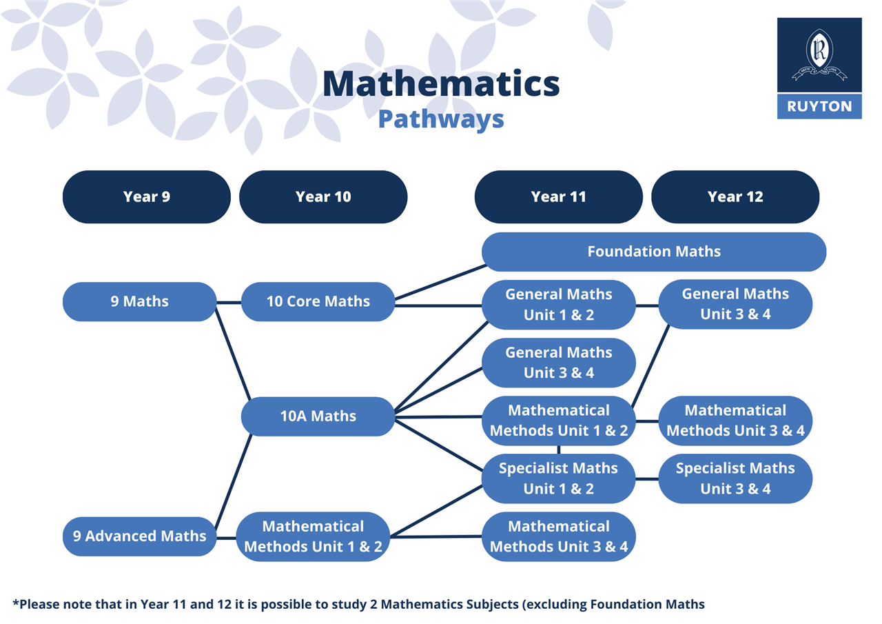 At Year 10, students will study Year 10 Mathematics in Semester 1. Students already in the Core program from year 9 will continue to be offered Core level assessment during the Semester. If students have been part of the advanced program in previous years, they may choose to study VCE Mathematical Methods 1 and 2 or undertake Year 10 Mathematics.